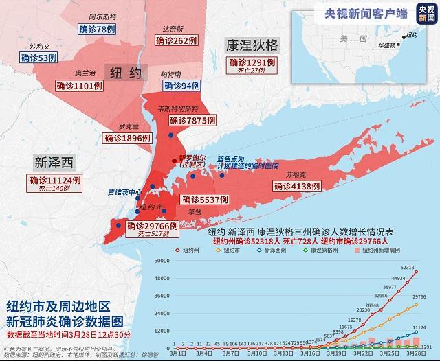 当地时间3月28日,美国纽约州州长科莫在每日新冠肺炎疫情发布会上表示,目前纽约州确诊感染新冠肺炎人数已经达到52318人,死亡728人。其中,纽约市新冠肺炎确诊人数已经逼近3万。