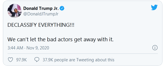 随后,特朗普长子小特朗普也发推称:“公开一切!!不能让坏演员逃脱。”