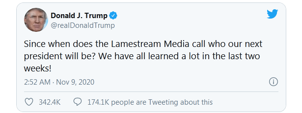特朗普在推特上称:“什么时候开始,由媒体来宣布我们的下任总统了?过去两周,我们学到了很多!”