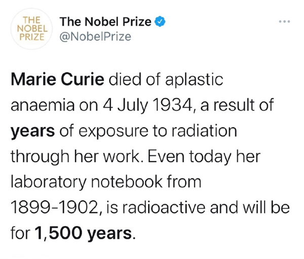 现在,诺贝尔官方给出科普公告显示,玛丽·居里的实验笔记必须保存在铅盒中,因为它们仍然具有放射性而且还会延续1500年。