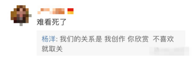 而后在面对其他粉丝的话的时候,杨洋也是十分霸气地回怼了,甚至表示我们的关系就是我创作你欣赏,你不喜欢可以取关。说实话,小编也是很少见到偶像如此硬气直接怼自己家粉丝的。