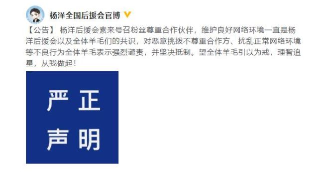 确实有时候粉丝的这种过激行为会给偶像带来很大的困扰,而杨洋的后援会也是表示要尊重合作伙伴,维护良好的网络环境,并且希望羊毛们可以理智追星。