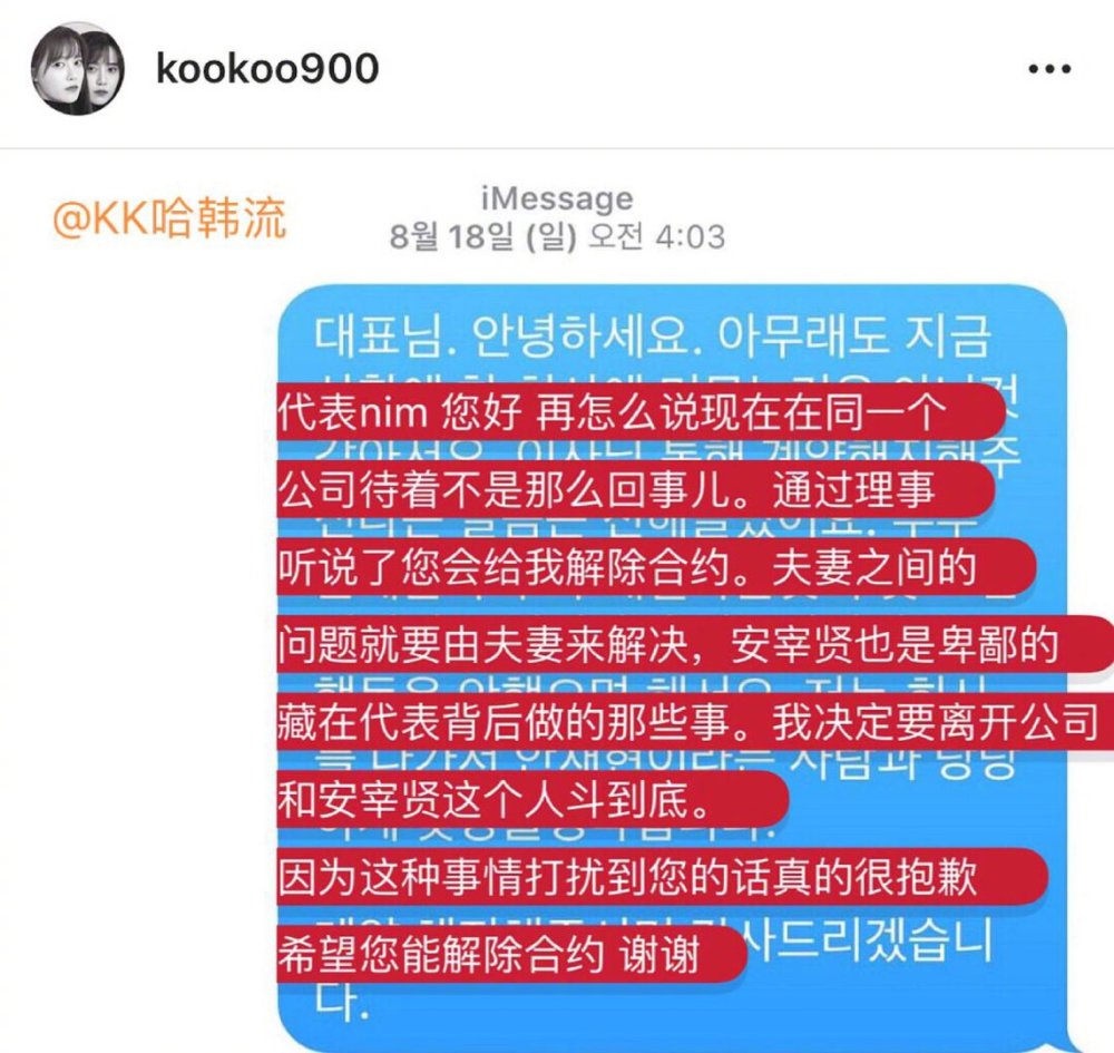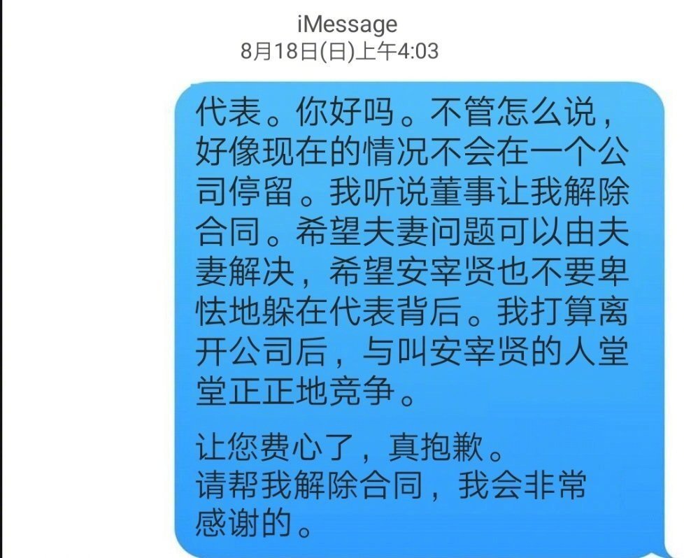 截图上写着:“这是8月发送的文字,已经是10月了,公司参与了安宰贤的离婚,我和我的信赖已经受到了损害。”