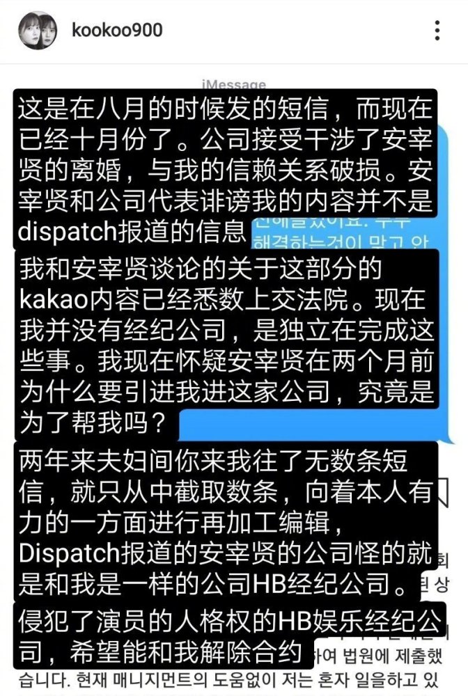 10月7日,据韩媒报道,具惠善向经纪公司HB娱乐公司提出了解除合同的要求,并且还晒出了短信的截图。