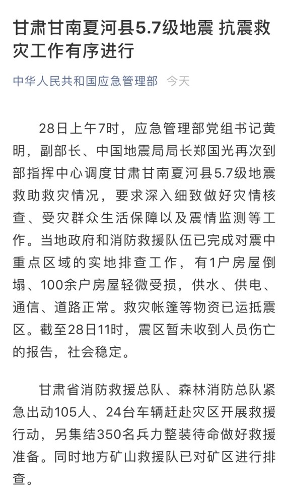 据应急管理部10月28日消息,28日上午7时,应急管理部党组书记黄明,副部长、中国地震局局长郑国光再次到部指挥中心调度甘肃甘南夏河县5.7级地震救助救灾情况,要求深入细致做好灾情核查、受灾群众生活保障以及震情监测等工作。