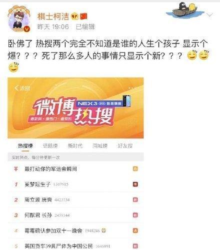 而当天还有一件事情也是让我们很吃惊的消息,让我们觉得不可思议。但是同样让我们吃惊的事情,娱乐圈的排名很靠前,因此柯洁发了一个微博去表达自己的态度与观点,其中也显示出了很多不满。