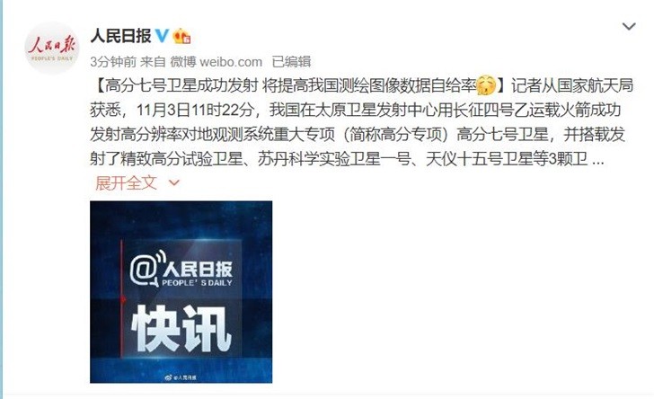 11月3日消息 据人民日报消息,11月3日11时22分,我国在太原卫星发射中心用长征四号乙运载火箭成功发射高分辨率对地观测系统重大专项(简称高分专项)高分七号卫星,并搭载发射了精致高分试验卫星、苏丹科学实验卫星一号、天仪十五号卫星等3颗卫星。高分七号卫星作为我国首颗民用亚米级光学传输型立体测绘卫星,运行后将在国土测绘、城乡建设、统计调查等方面发挥重要作用,为城市群发展规划、农业农村建设提供有力保障,为建设小康社会提供重要支撑。