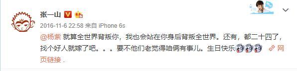 16年的时候张一山曾发文支持杨紫,就算全世界背叛你,我也会站在你身后背叛全世界。还提醒杨紫早点找个好人嫁了,真的是很暖心的孩子。