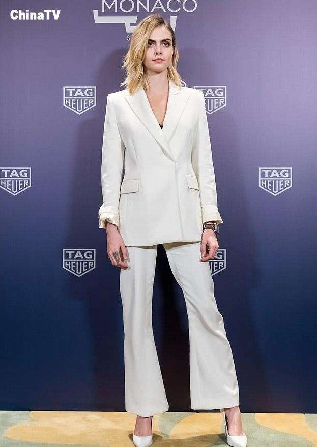 卡拉穿了纯白色的西装亮相,搭配上她那迷人的金色短发,显得又酷又有范儿。脸上化着不太浓烈的小烟熏装,瞬间让超模的气场开到最大。干练精致,妥妥的职场女王气质了。