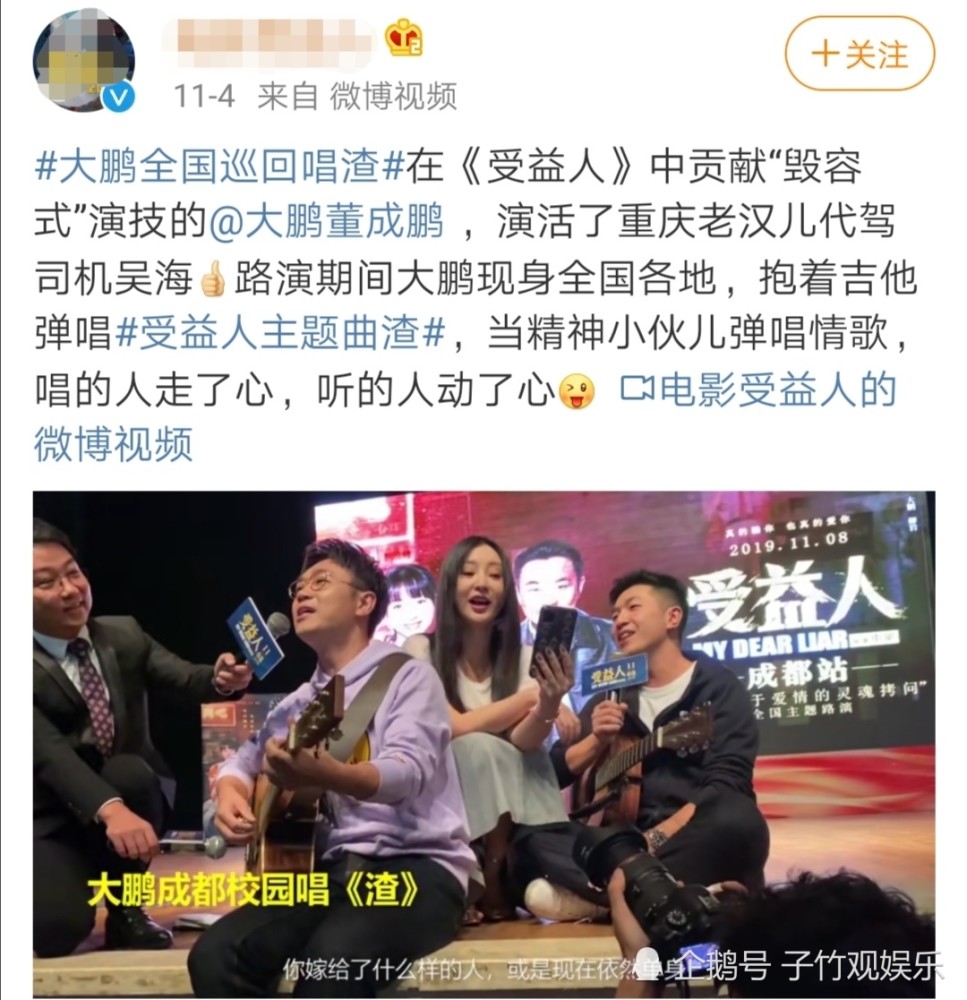 最近在《受益人》预告片中,被网友戏称贡献了“毁容式”演技的大鹏 ,现身全国各地,抱着吉他弹唱《受益人》主题曲《渣》。