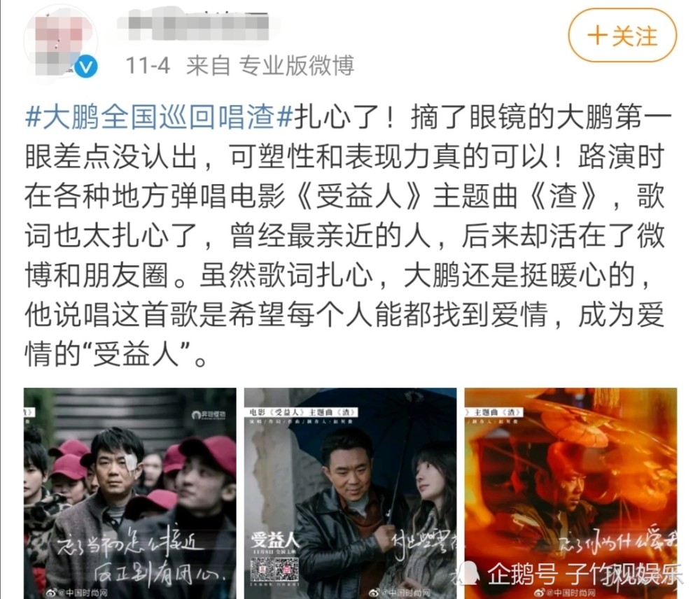 据悉,影片即将在11月7日开启全国超前点映,已经听了这么好听的《渣》,真的很期待大鹏的新电影《受益人》,会给我们带来怎样的精彩啊!