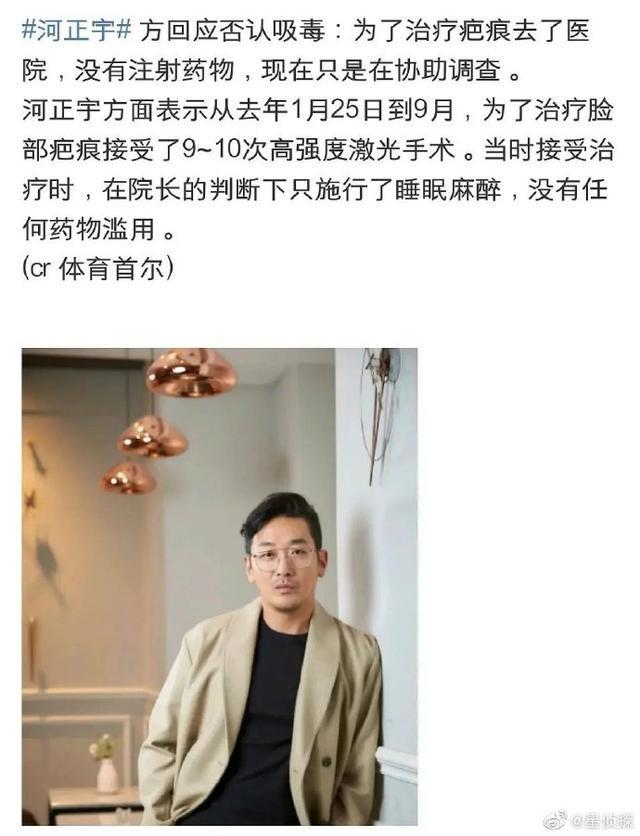 河正宇方否认吸毒,刚刚,河正宇方回应吸毒传闻,表示河正宇从去年1月25日到9月,为了治疗脸部疤痕接受了9~10次高强度激光手术,在院长的判断下施行了睡眠麻醉,并没有注射药物,现在只是在协助调查。
