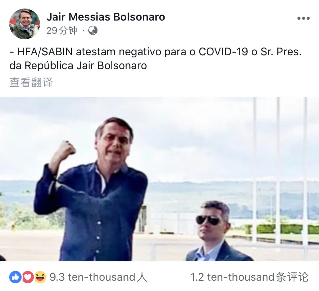 此外,博索纳罗还在脸书上发布消息称,“武装部队医院和Sabin(检测实验室)已经给了总统博索纳罗一份新冠病毒检测呈阴性的结果。”