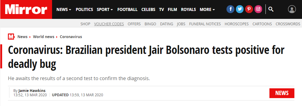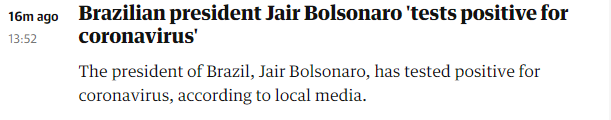 巴西总统雅伊尔·博索纳罗之子,参议员爱德华多·博索纳罗在个人社交媒体账号上表示:“很多的谎言,很少的信息,随总统博索纳罗赴美代表团的检测还没有出结果。总是有人在媒体上散布谣言,如果之后消息确实,他们会说‘我就说过!’,如果没有,就是又一个假消息。”此前,多家媒体报道,博索纳罗新冠病毒检测呈阳性。目前巴西政府对此并未作出官方表态。