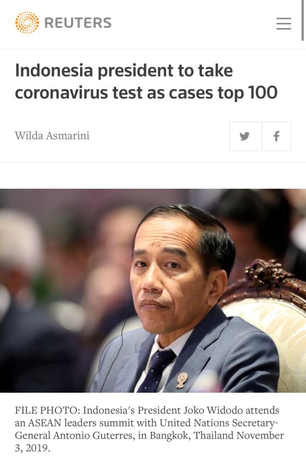 英国路透社最新消息,印尼总统佐科15日宣布将接受新冠病毒检测。