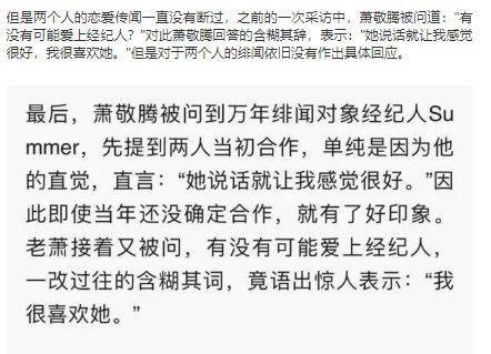 萧敬腾在一档采访类访谈中,小S和蔡永康两个主持人询问他女友是不是经纪人的时候,一度引发了很长时间的沉默,画面虽然尴尬,萧敬腾的话语又透露出很重要的信息。萧敬腾也默认了这样一件事情,他坦言这是一件很重要的事情,需要自己亲自说出来。
