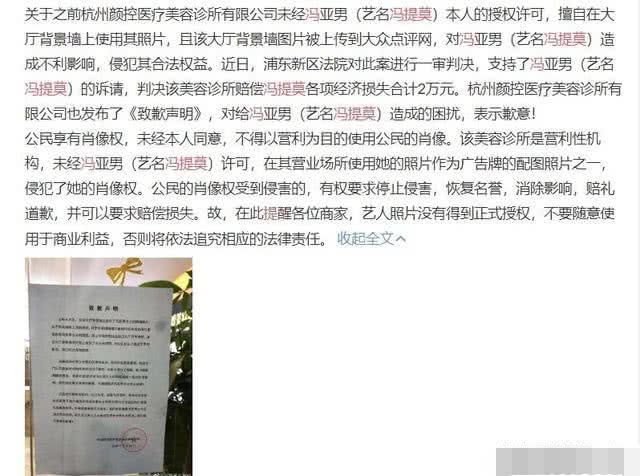 在冯提莫得知这个消息后,就立刻把这家整形医院以侵犯肖像权的罪名状告法院,要求美容诊所公开赔礼道歉,并且索赔总计105万元的经济损失。而值得一说的是,某媒体在民事判决书中获悉,最后法院执行的判决是责令这家整形医院在其经营场所接待大厅内发布道歉声明,同时赔偿冯提莫各项经济损失共计2万元。
