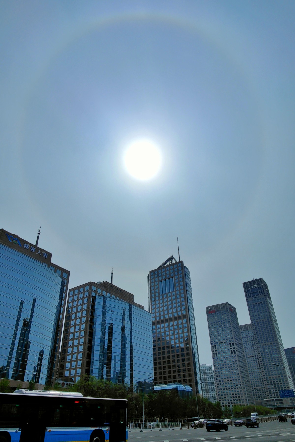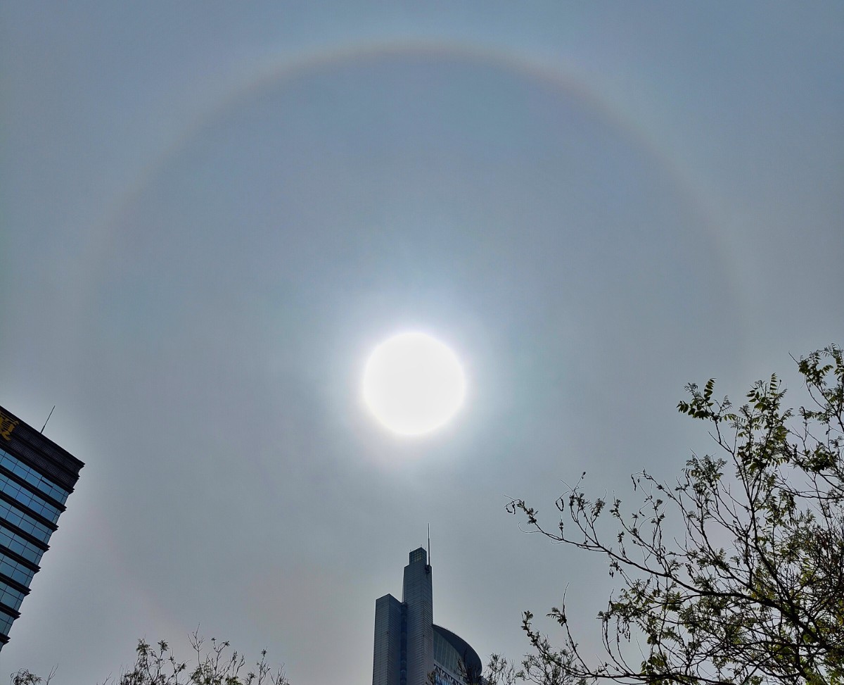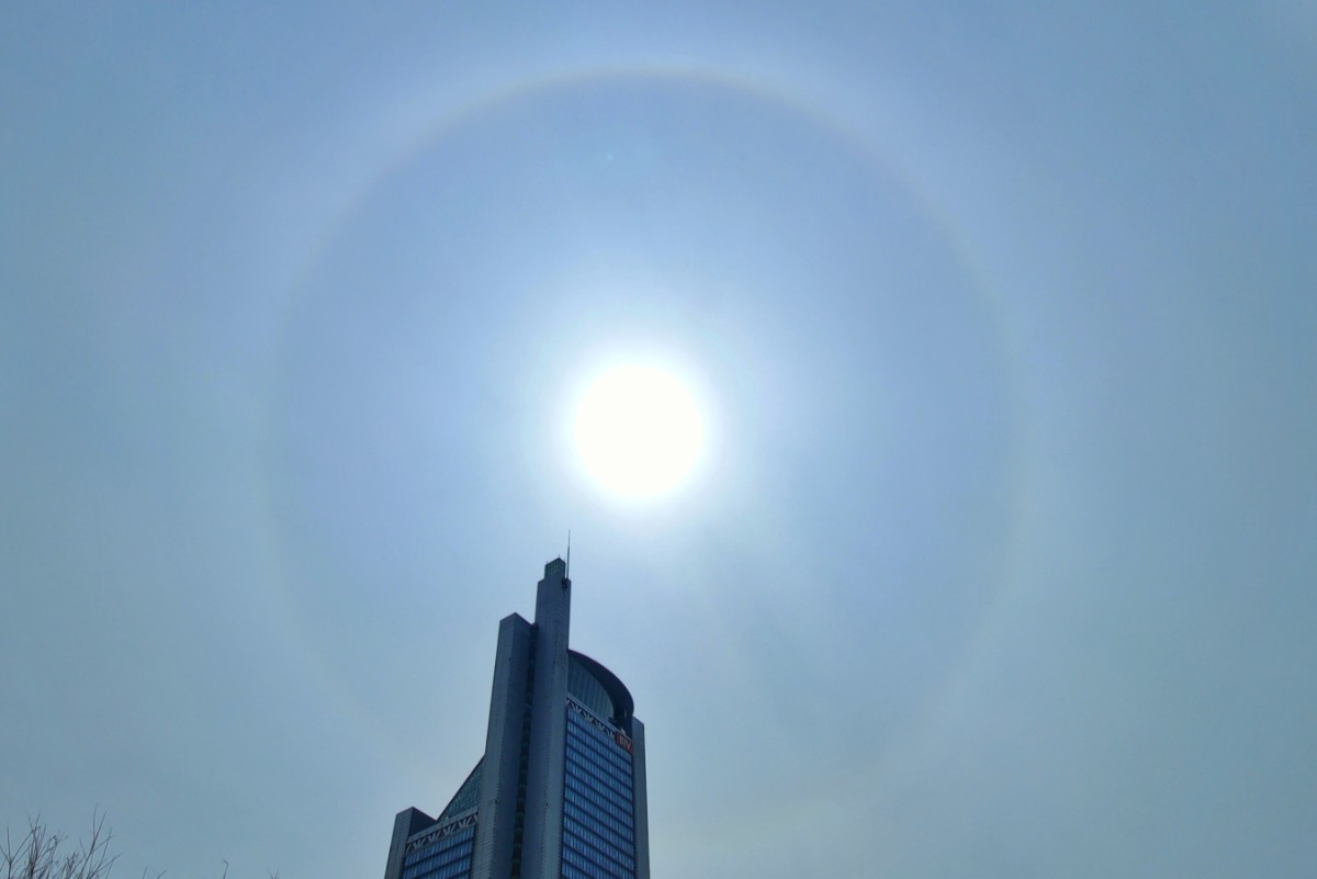 此刻,京城天空,一道美丽的日晕出现在太阳周边。日晕是阳光通过云层时,受冰晶折射或反射而形成的一种大气光学现象。
