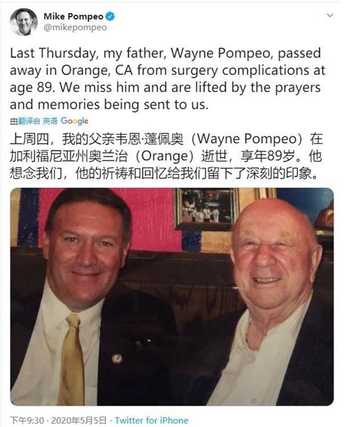 【蓬佩奥父亲在加州去世】据美国国务卿迈克尔·蓬佩奥的个人账号5月5日发布的消息称,他的父亲韦恩·蓬佩奥(Wayne Pompeo)4月30日在美国加利福尼亚州奥兰治(Orange)因手术并发症逝世,享年89岁。目前奥兰治县受新冠病毒疫情影响严重,不过蓬佩奥并未透露其父亲是否死于新冠病毒引发的并发症。