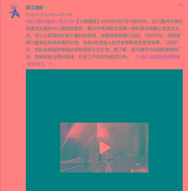 大众网·海报新闻济南5月7日讯(记者 张海振)浙江省消防救援总队官方微博发布火情通报,2020年5月7日12时49分,嘉兴市消防救援支队指挥中心接到报警称:嘉兴市秀洲区王店镇一塑料泡沫包装公司发生火灾。中心立即调派扑救力量赶赴现场,全勤指挥部遂行出动。