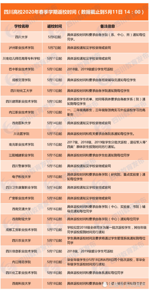 截止到5月11日,四川已有24所高校宣布返校时间,各大高校返校时间表已整理好,方便大家查阅,各位小伙伴请尽快了解。
