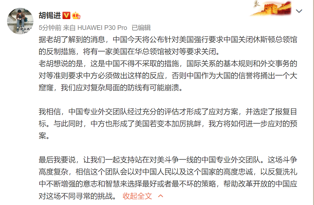 据老胡了解到的消息,中国今天将公布针对美国强行要求中国关闭休斯顿总领馆的反制措施,将有一家美国在华总领馆被对等要求关闭。