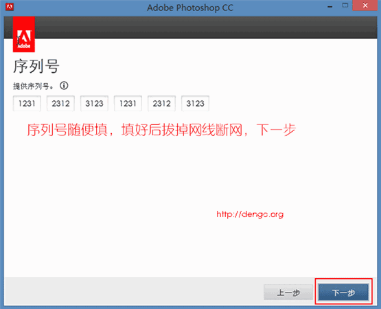 3、序列号随便填,填好后拔掉网线断网,点击下一步。