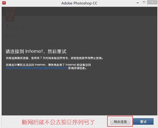 4、断网后就不会去验证序列号了,点击稍后连接,可以先安装。