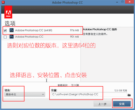 5、如果是64位的系统就选64位的版本,32位的选32位的版本,选择语言、安装位置,就可以点击安装了。