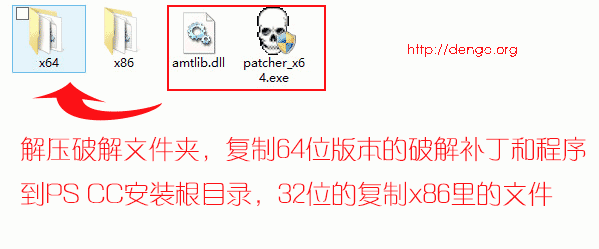 7、解压破解文件夹,里面有64位和32位的破解文件,复制相应的文件到Photoshop CC的安装根目录。