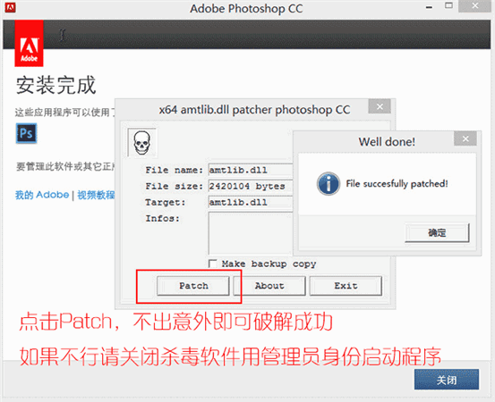 9、点击Patch,不出意外即可破解成功,如果出现错误请关闭杀毒软件,或用管理员身份启动即可。