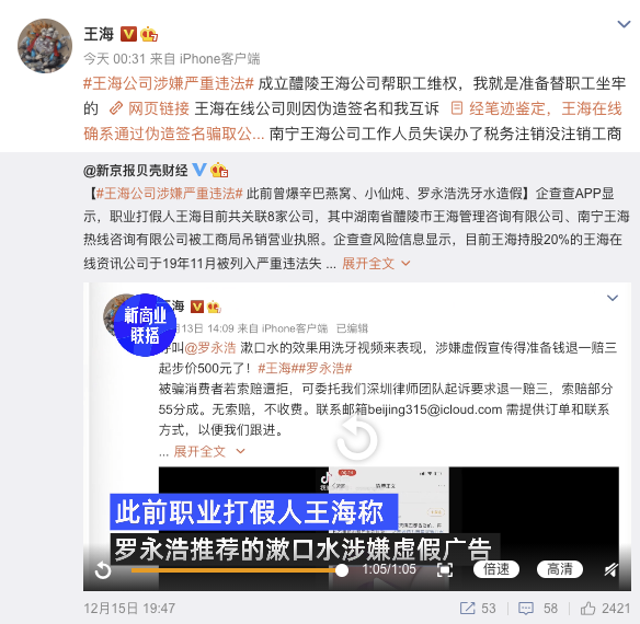 12月16日凌晨,针对王海公司涉嫌严重违法一事,王海在个人微博回应称:“成立醴陵王海公司帮职工维权,我就是准备替职工坐牢的;王海在线公司则因伪造签名和我互诉;南宁王海公司工作人员失误办了税务注销没注销工商。”