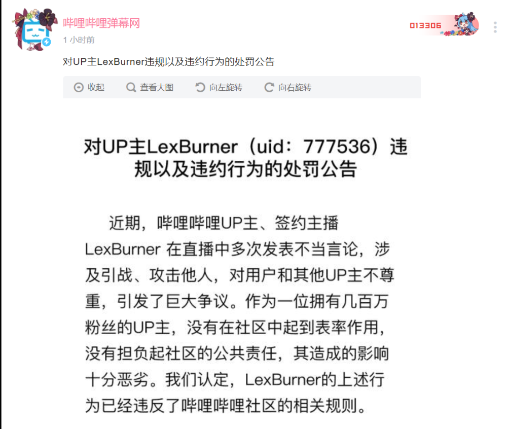 就在事件发酵了几天之后,B站官方终于出手了,签约主播Lexburner在直播中多次发表不当言论,涉及引战、攻击他入,对用户以及其他UP主不尊重,引发了巨大争议。影响十分恶劣,违反了哔哩哔哩社区规定。