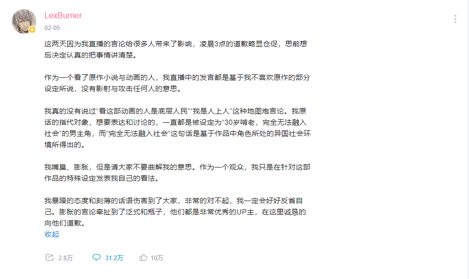 道歉之后就迎来了《无职转生》被全网下架,虽然说这是一部有“争议”的番剧,但这个时间段真让人有种说不出的滋味,不喜欢就让他不存在吗?虽然下架和“LexBurner”没有直接关系,但我觉得如果不是他的影响,绝对不会有被下架的窘境。