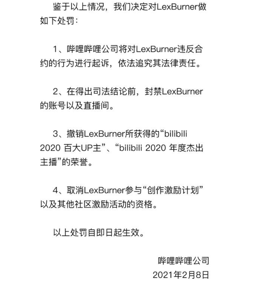 首先是起诉,追究其不当言论对于社区的影响,其次在得出结论之前封禁账号和直播间。撤销他在去年得到的两个奖项“bilibili2020百大UP主”以及“bilibili2020年度杰出主播”的荣誉。取消所参加的“创作激励计划”以及其他社区激励活动的资格。前三条都好理解,最后一条就是取消在B站能够得到收益的权利。