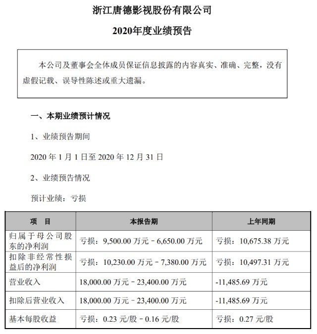 今年1月29日,唐德影视发布2020年业绩预告,预计2020年度归属净利润亏损9500万元-6650万元,扣非净利润亏损10230万元-7380万元。