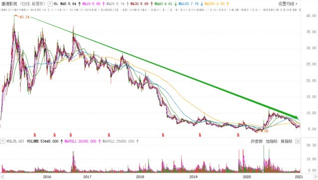 唐德影视业绩不断滑坡,公司股价也受到拖累,从2015年5月至今,公司股价从40元出头开始掉头向下,至今累计跌超80%(前复权),比“腰斩”更惨,总市值跌至27亿元。