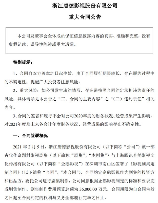 唐德影视表示,本合同的签署和履行不会对公司2020年度的财务状况、经营成果产生影响,对2021年度及未来各会计年度财务状况、经营成果的影响存在不确定性。