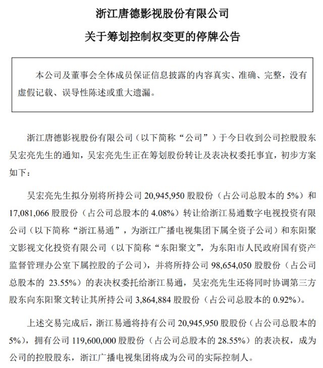 虽然上市地位暂时保住了,但唐德影视依然前景不明。2020年5月,唐德影视原实控人吴宏亮萌生退意,将部分股权转让出去。交易完成后,浙江广电成为唐德影视新的实控人。
