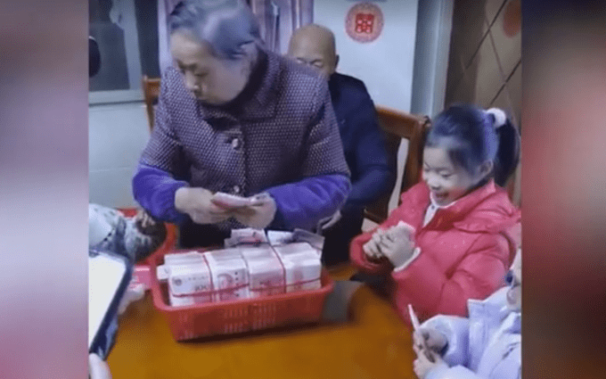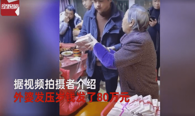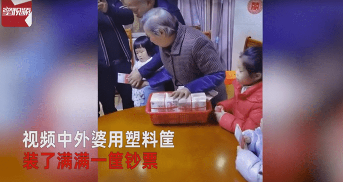 原标题:霸气外婆用筐装80万给大家发红包 发钱现场让人羡慕