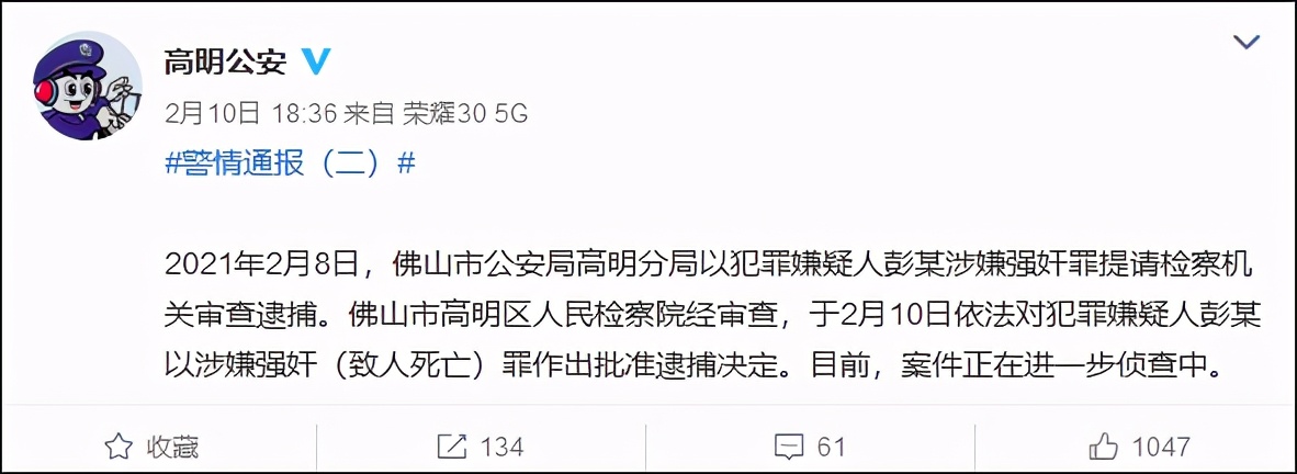 2月10日晚间,广东佛山高明公安发布警情通报,2021年2月8日,佛山市公安局高明分局以犯罪嫌疑人彭某涉嫌强奸罪提请检察机关审查逮捕。佛山市高明区人民检察院经审查,于2月10日依法对犯罪嫌疑人彭某以涉嫌强奸(致人死亡)罪作出批准逮捕决定。目前,案件正在进一步侦查中。