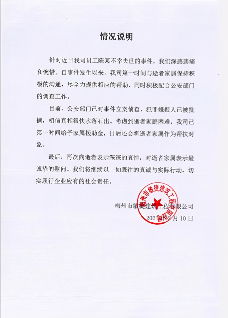 梅州建筑发表的声明显示:对此次事件深感悲痛和惋惜。并指出自事件发生以来,公司第一时间与陈某梅家属保持积极沟通,尽全力提供相应的帮助,同时积极配合公安部门的调查工作。考虑到陈某梅家庭困难,已给予家属援助金,后续还会将陈某梅家属作为帮扶对象给予关怀和帮助。