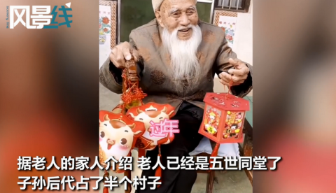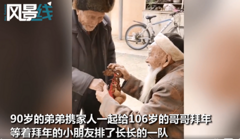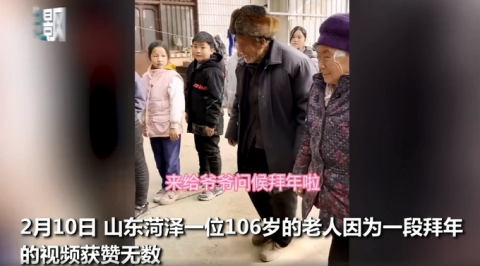 2月10日,山东菏泽一位106岁的老人因为一段拜年的视频获赞无数。90岁的弟弟携家人一起给106岁的哥哥拜年,等着拜年的小朋友排了长长的一队。老人家精神矍铄,红光满面,乐呵呵地祝福后辈们身体健康。据老人的家人介绍,老人已经是五世同堂了,子孙后代占了半个村子。