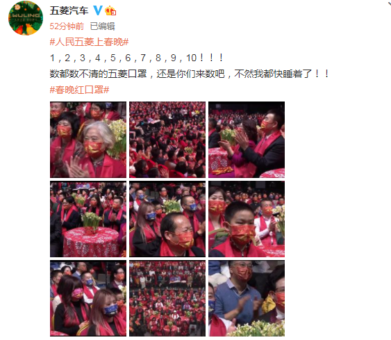 在春晚开始不久,五菱汽车也发文表示,数都数不清的五菱口罩,还是你们来数吧!