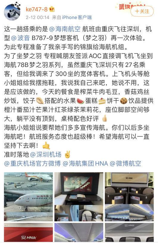 一名微博网友 2月12日凌晨发微博称,为了乘坐海南航空的 梦之羽 ,他专程喊朋友签派AOC直接调飞机,虽然重庆到深圳只有27名乘客,但是给他调来了300座的宽体飞机。他还专门准备了锦旗送给了海航机组。