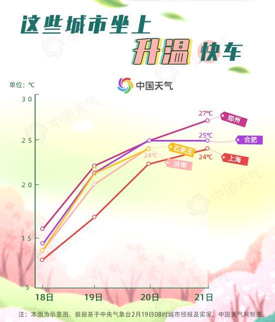大城市中,石家庄、济南、郑州、合肥、上海升温都在10℃以上。上海昨天最高气温仅有9℃,21日达到24℃,直升15℃。
