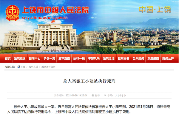 近日有媒体报道,上饶市中级人民法院官网发布消息称,关于被告人王小建故意杀人的案件,最高人民法院日前依法核准了王小建死刑。依照最高人民法院于2021年1月28日发布的执行死刑令,上饶市中级人民法院依法执行了王小建的死刑。